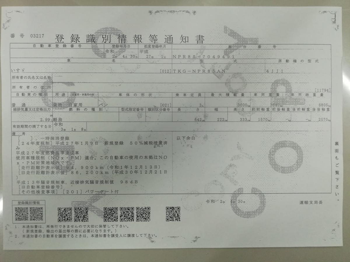 | 型 式 | TKG-NPR85AN | 車台番号 | NPR85-704**** | ||||||||||||