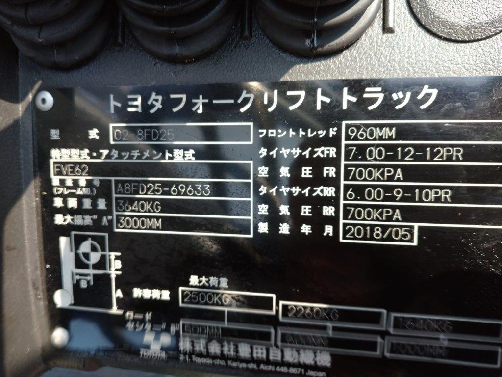 型式: 02-8FD25 製番:69633 2.5ton, ディーゼル 3m/2段フルフリーマスト オートマティック サイドシフト・前後エアタイヤ 2018年5月製 アワー:2782時間 |