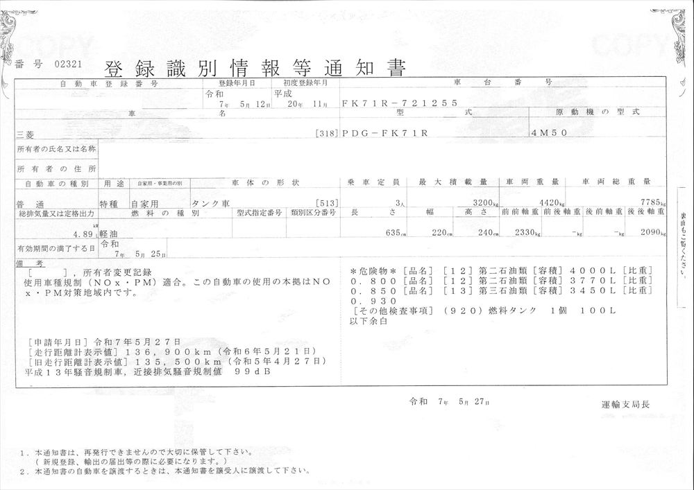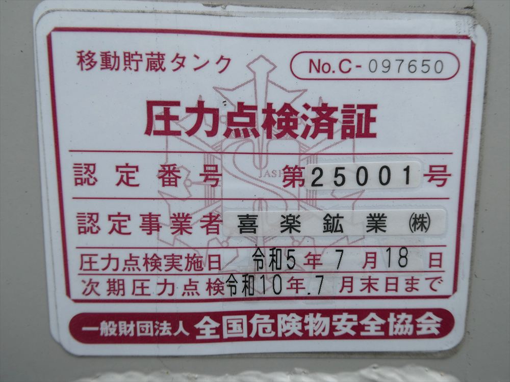 | 形状詳細 | タンクローリー | 積載量 | 3,200 kg | ||||||||||||
