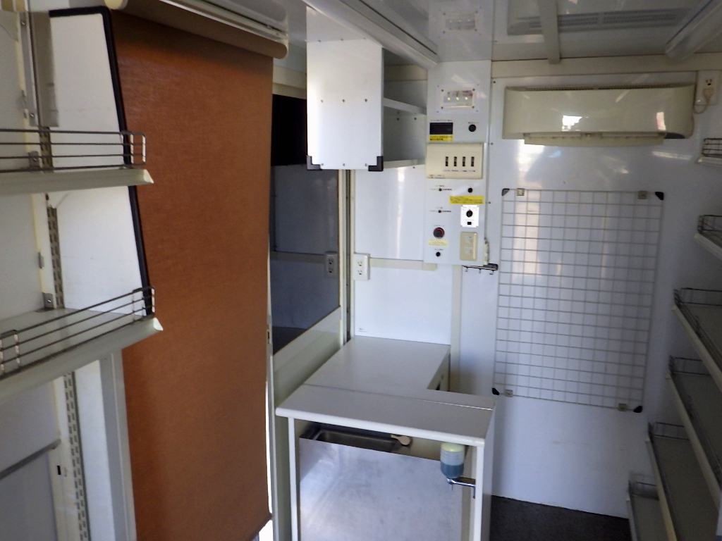 ☆リア&左サイド階段付き出入口/換気扇/陳列棚 ☆荷台べバストヒーター/SD再生/マイク外部スピーカー ☆外部電源取入コンセント/簡易シンク/床下水タンク ☆バックモニター/ドライブレコーダー ☆車両総重量4985kg/800kg |