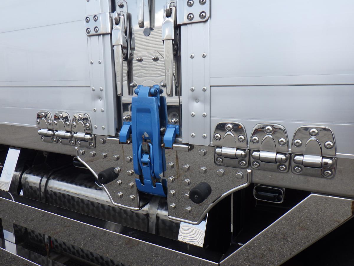 ラッシングレール2段 内フック12対 中柱回転式 インターロック、ウイングスイッチ前後有 門口、蝶番、キャッチ、ロックバーステンレス セイコーラックステンレス