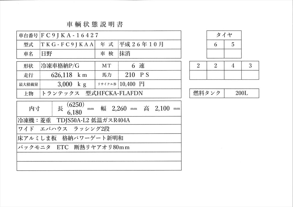 型式 TKG-FC9JKAA 車台番号 FC9JKA-16427 ワイド ボデー内寸 L6.18m W2.26m H2.1m 格納パワゲート 新明和 冷凍機:菱重 TDJS50A-L2 上物箱:トランテックス 床アルミしま板 バックモニタ ETC |