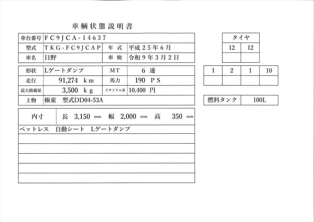 | 形状詳細 | 砂利ダンプ | 積載量 | 3,500 kg | ||||||||||||