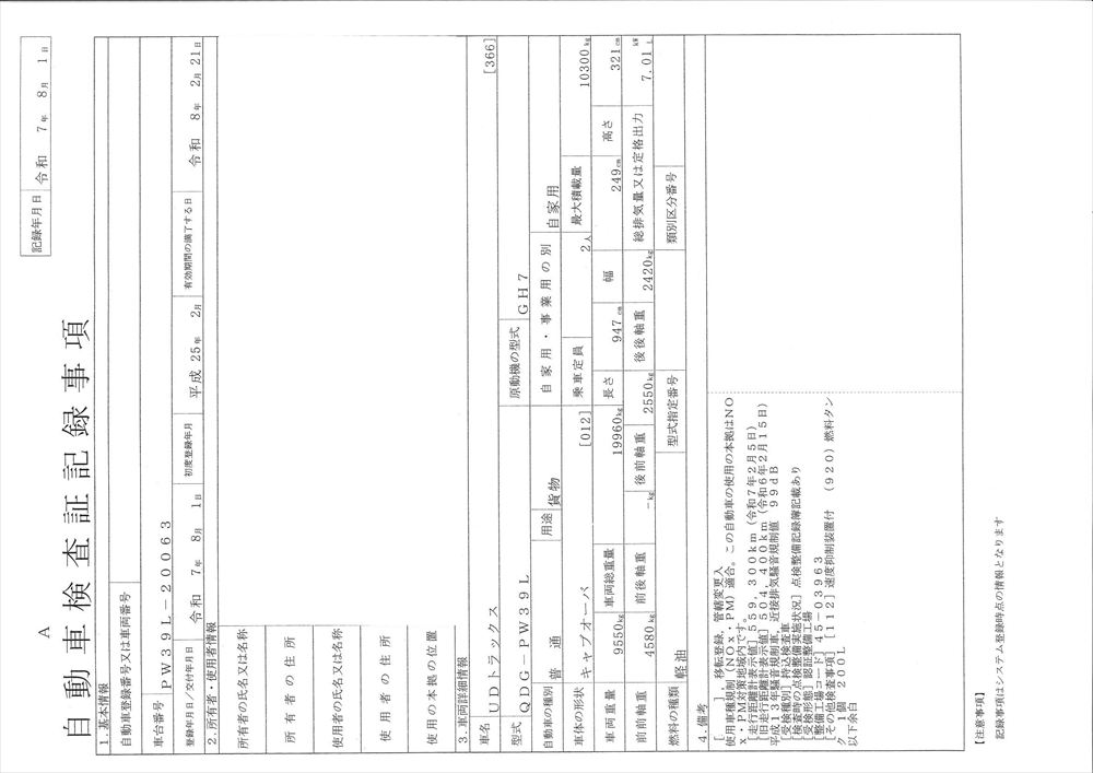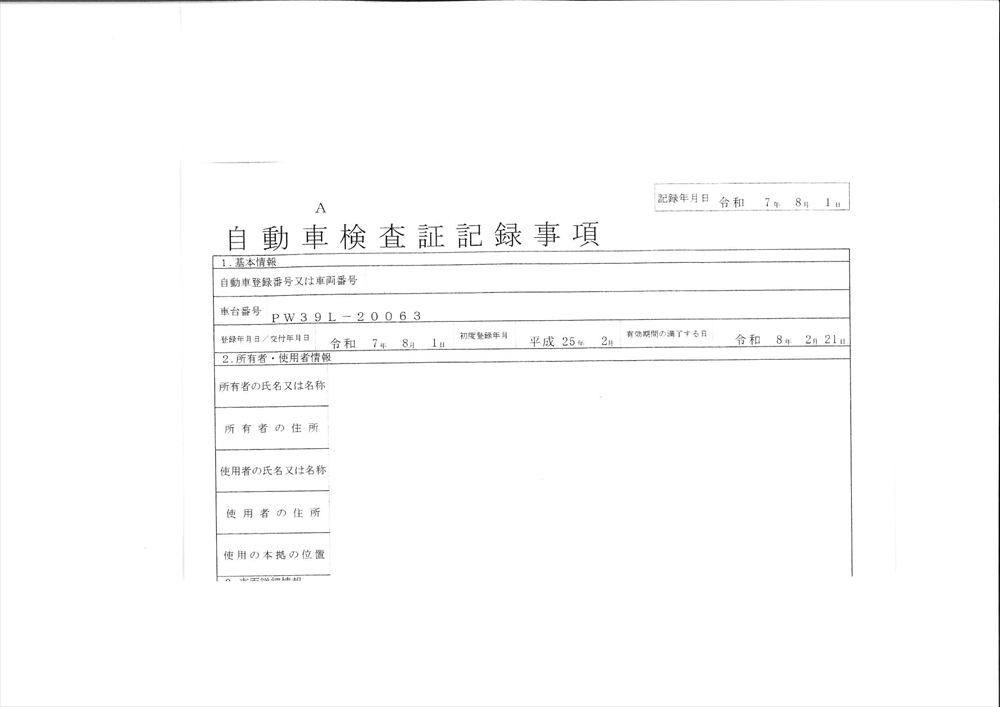 | 型 式 | QDG-PW39L | 車台番号 | PW**** | ||||||||||||