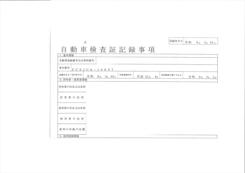 | 型 式 | TKG-FC9JCAP | 車台番号 | FC9**** | ||||||||||||