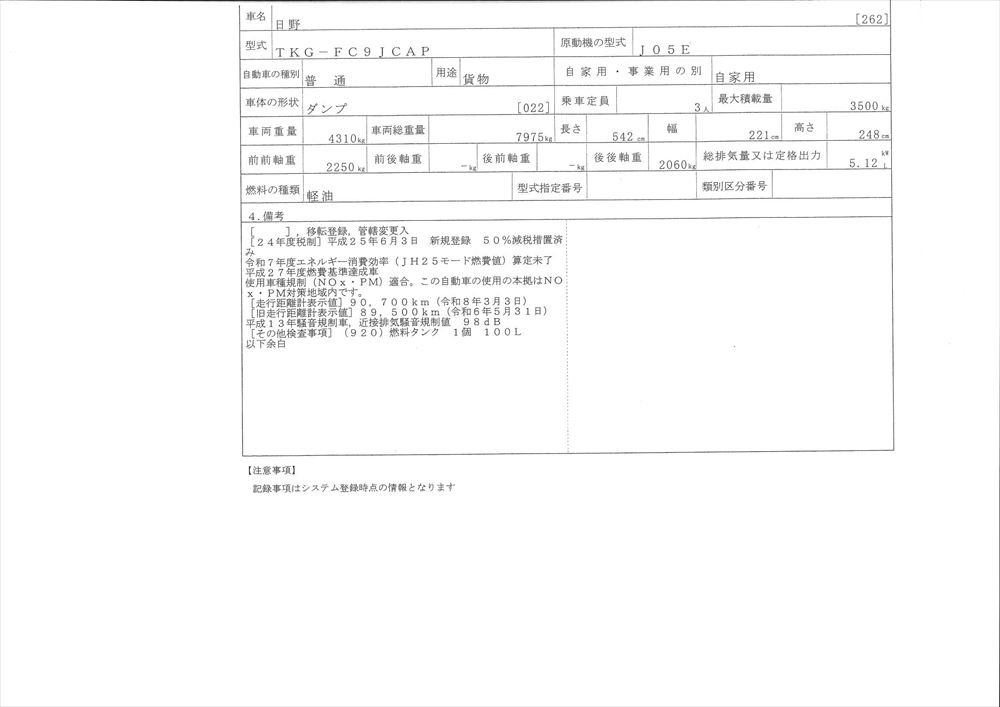 | 形状詳細 | 砂利ダンプ | 積載量 | 3,500 kg | ||||||||||||