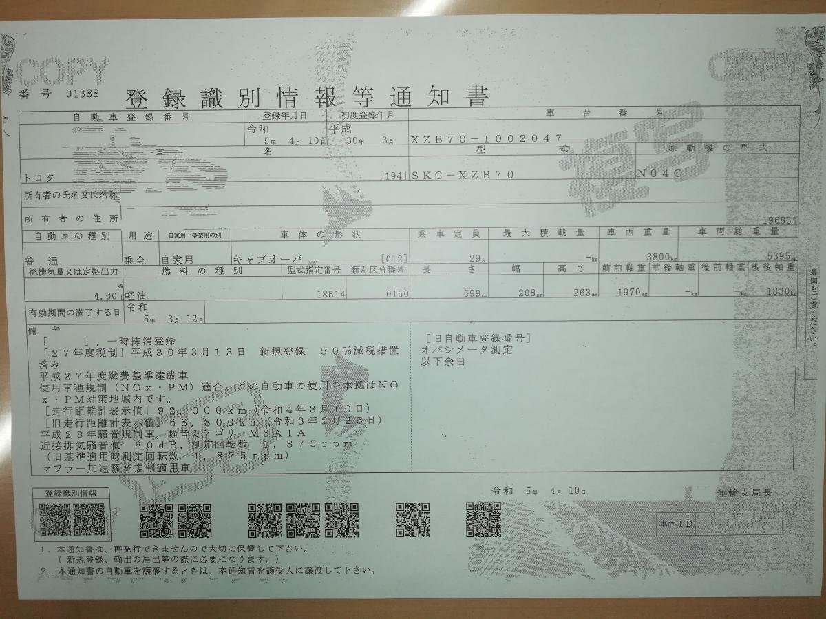 | 型 式 | SKG-XZB70 | 車台番号 | XZB70-100**** | ||||||||||||