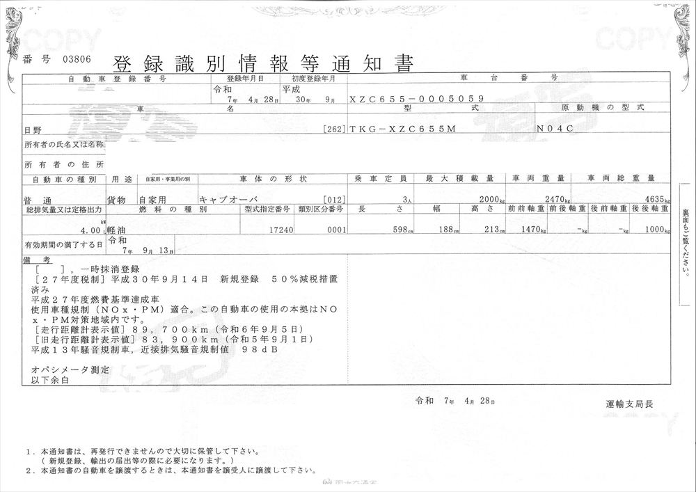 | 型 式 | TKG-XZC655M | 車台番号 | XZC**** | ||||||||||||