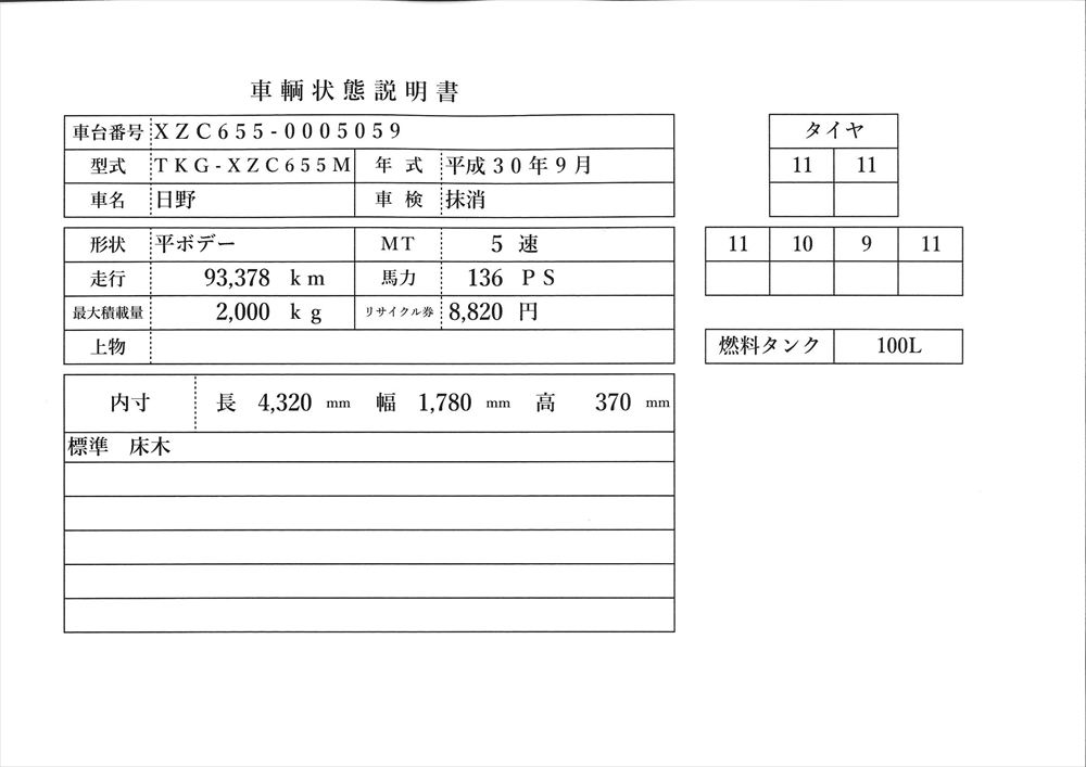 | 形状詳細 | 木平 | 積載量 | 2,000 kg | ||||||||||||