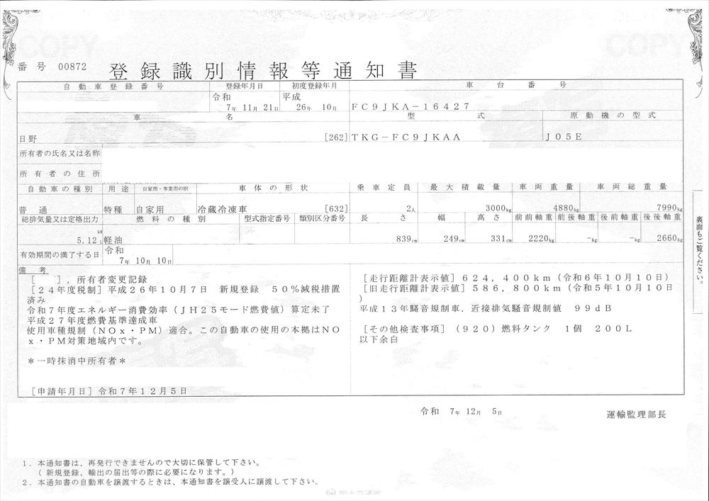 | 形状詳細 | 冷凍車 | 積載量 | 3,000 kg | ||||||||||||