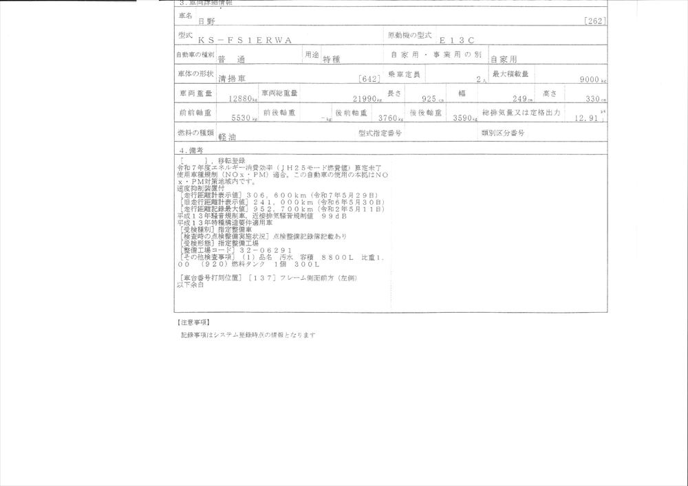 | 形状詳細 | 清掃車 | 積載量 | 9,000 kg | ||||||||||||